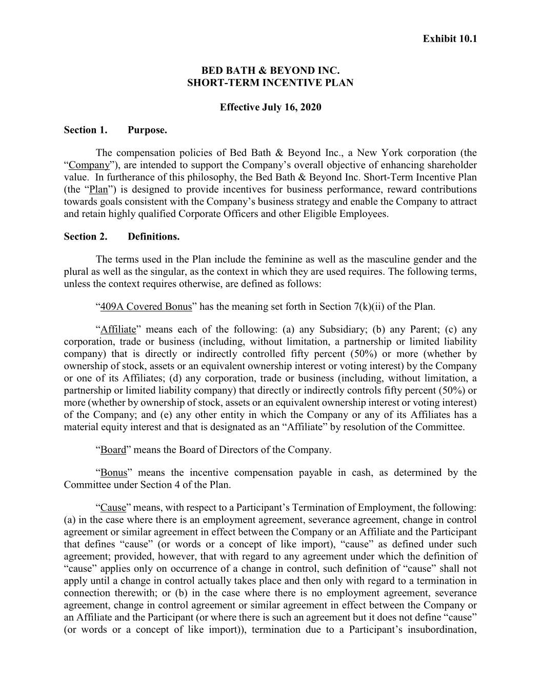 Exhibit 10.1 BED BATH & BEYOND INC. SHORT-TERM INCENTIVE PLAN Effective July 16, 2020 Section 1. Purpose. The compensation policies of Bed Bath & Beyond Inc., a New York corporation (the “Company”), are intended to support the Company’s overall objective of enhancing shareholder value. In furtherance of this philosophy, the Bed Bath & Beyond Inc. Short-Term Incentive Plan (the “Plan”) is designed to provide incentives for business performance, reward contributions towards goals consistent with the Company’s business strategy and enable the Company to attract and retain highly qualified Corporate Officers and other Eligible Employees. Section 2. Definitions. The terms used in the Plan include the feminine as well as the masculine gender and the plural as well as the singular, as the context in which they are used requires. The following terms, unless the context requires otherwise, are defined as follows: “409A Covered Bonus” has the meaning set forth in Section 7(k)(ii) of the Plan. “Affiliate” means each of the following: (a) any Subsidiary; (b) any Parent; (c) any corporation, trade or business (including, without limitation, a partnership or limited liability company) that is directly or indirectly controlled fifty percent (50%) or more (whether by ownership of stock, assets or an equivalent ownership interest or voting interest) by the Company or one of its Affiliates; (d) any corporation, trade or business (including, without limitation, a partnership or limited liability company) that directly or indirectly controls fifty percent (50%) or more (whether by ownership of stock, assets or an equivalent ownership interest or voting interest) of the Company; and (e) any other entity in which the Company or any of its Affiliates has a material equity interest and that is designated as an “Affiliate” by resolution of the Committee. “Board” means the Board of Directors of the Company. “Bonus” means the incentive compensation payable in cash, as determined by the Committee under Section 4 of the Plan. “Cause” means, with respect to a Participant’s Termination of Employment, the following: (a) in the case where there is an employment agreement, severance agreement, change in control agreement or similar agreement in effect between the Company or an Affiliate and the Participant that defines “cause” (or words or a concept of like import), “cause” as defined under such agreement; provided, however, that with regard to any agreement under which the definition of “cause” applies only on occurrence of a change in control, such definition of “cause” shall not apply until a change in control actually takes place and then only with regard to a termination in connection therewith; or (b) in the case where there is no employment agreement, severance agreement, change in control agreement or similar agreement in effect between the Company or an Affiliate and the Participant (or where there is such an agreement but it does not define “cause” (or words or a concept of like import)), termination due to a Participant’s insubordination,