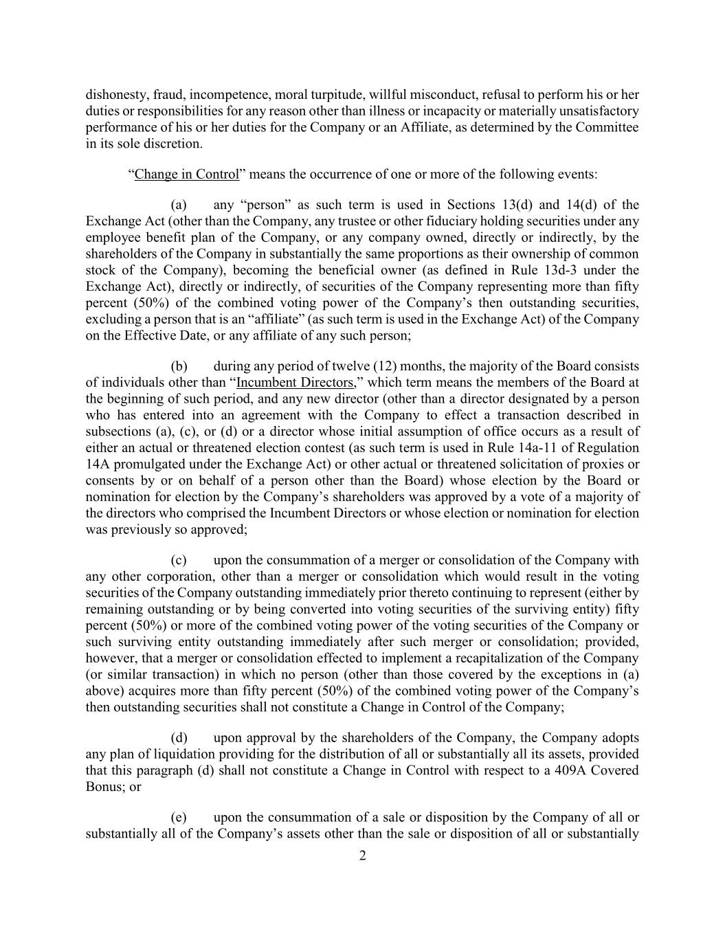 dishonesty, fraud, incompetence, moral turpitude, willful misconduct, refusal to perform his or her duties or responsibilities for any reason other than illness or incapacity or materially unsatisfactory performance of his or her duties for the Company or an Affiliate, as determined by the Committee in its sole discretion. “Change in Control” means the occurrence of one or more of the following events: (a) any “person” as such term is used in Sections 13(d) and 14(d) of the Exchange Act (other than the Company, any trustee or other fiduciary holding securities under any employee benefit plan of the Company, or any company owned, directly or indirectly, by the shareholders of the Company in substantially the same proportions as their ownership of common stock of the Company), becoming the beneficial owner (as defined in Rule 13d-3 under the Exchange Act), directly or indirectly, of securities of the Company representing more than fifty percent (50%) of the combined voting power of the Company’s then outstanding securities, excluding a person that is an “affiliate” (as such term is used in the Exchange Act) of the Company on the Effective Date, or any affiliate of any such person; (b) during any period of twelve (12) months, the majority of the Board consists of individuals other than “Incumbent Directors,” which term means the members of the Board at the beginning of such period, and any new director (other than a director designated by a person who has entered into an agreement with the Company to effect a transaction described in subsections (a), (c), or (d) or a director whose initial assumption of office occurs as a result of either an actual or threatened election contest (as such term is used in Rule 14a-11 of Regulation 14A promulgated under the Exchange Act) or other actual or threatened solicitation of proxies or consents by or on behalf of a person other than the Board) whose election by the Board or nomination for election by the Company’s shareholders was approved by a vote of a majority of the directors who comprised the Incumbent Directors or whose election or nomination for election was previously so approved; (c) upon the consummation of a merger or consolidation of the Company with any other corporation, other than a merger or consolidation which would result in the voting securities of the Company outstanding immediately prior thereto continuing to represent (either by remaining outstanding or by being converted into voting securities of the surviving entity) fifty percent (50%) or more of the combined voting power of the voting securities of the Company or such surviving entity outstanding immediately after such merger or consolidation; provided, however, that a merger or consolidation effected to implement a recapitalization of the Company (or similar transaction) in which no person (other than those covered by the exceptions in (a) above) acquires more than fifty percent (50%) of the combined voting power of the Company’s then outstanding securities shall not constitute a Change in Control of the Company; (d) upon approval by the shareholders of the Company, the Company adopts any plan of liquidation providing for the distribution of all or substantially all its assets, provided that this paragraph (d) shall not constitute a Change in Control with respect to a 409A Covered Bonus; or (e) upon the consummation of a sale or disposition by the Company of all or substantially all of the Company’s assets other than the sale or disposition of all or substantially 2