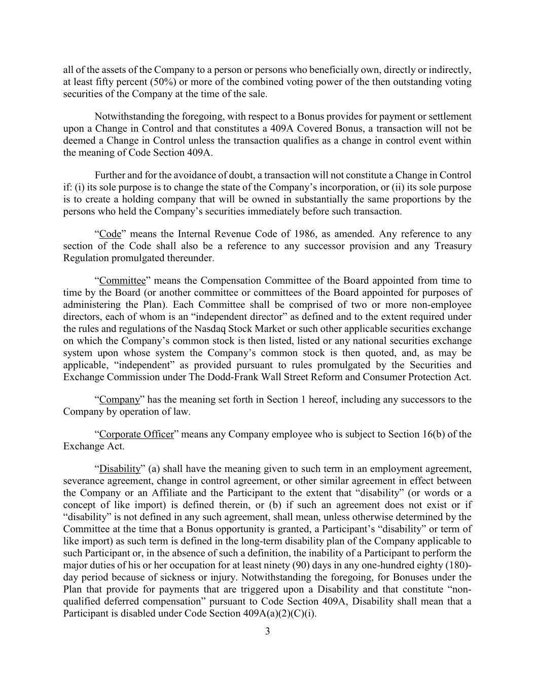 all of the assets of the Company to a person or persons who beneficially own, directly or indirectly, at least fifty percent (50%) or more of the combined voting power of the then outstanding voting securities of the Company at the time of the sale. Notwithstanding the foregoing, with respect to a Bonus provides for payment or settlement upon a Change in Control and that constitutes a 409A Covered Bonus, a transaction will not be deemed a Change in Control unless the transaction qualifies as a change in control event within the meaning of Code Section 409A. Further and for the avoidance of doubt, a transaction will not constitute a Change in Control if: (i) its sole purpose is to change the state of the Company’s incorporation, or (ii) its sole purpose is to create a holding company that will be owned in substantially the same proportions by the persons who held the Company’s securities immediately before such transaction. “Code” means the Internal Revenue Code of 1986, as amended. Any reference to any section of the Code shall also be a reference to any successor provision and any Treasury Regulation promulgated thereunder. “Committee” means the Compensation Committee of the Board appointed from time to time by the Board (or another committee or committees of the Board appointed for purposes of administering the Plan). Each Committee shall be comprised of two or more non-employee directors, each of whom is an “independent director” as defined and to the extent required under the rules and regulations of the Nasdaq Stock Market or such other applicable securities exchange on which the Company’s common stock is then listed, listed or any national securities exchange system upon whose system the Company’s common stock is then quoted, and, as may be applicable, “independent” as provided pursuant to rules promulgated by the Securities and Exchange Commission under The Dodd-Frank Wall Street Reform and Consumer Protection Act. “Company” has the meaning set forth in Section 1 hereof, including any successors to the Company by operation of law. “Corporate Officer” means any Company employee who is subject to Section 16(b) of the Exchange Act. “Disability” (a) shall have the meaning given to such term in an employment agreement, severance agreement, change in control agreement, or other similar agreement in effect between the Company or an Affiliate and the Participant to the extent that “disability” (or words or a concept of like import) is defined therein, or (b) if such an agreement does not exist or if “disability” is not defined in any such agreement, shall mean, unless otherwise determined by the Committee at the time that a Bonus opportunity is granted, a Participant’s “disability” or term of like import) as such term is defined in the long-term disability plan of the Company applicable to such Participant or, in the absence of such a definition, the inability of a Participant to perform the major duties of his or her occupation for at least ninety (90) days in any one-hundred eighty (180)- day period because of sickness or injury. Notwithstanding the foregoing, for Bonuses under the Plan that provide for payments that are triggered upon a Disability and that constitute “non- qualified deferred compensation” pursuant to Code Section 409A, Disability shall mean that a Participant is disabled under Code Section 409A(a)(2)(C)(i). 3