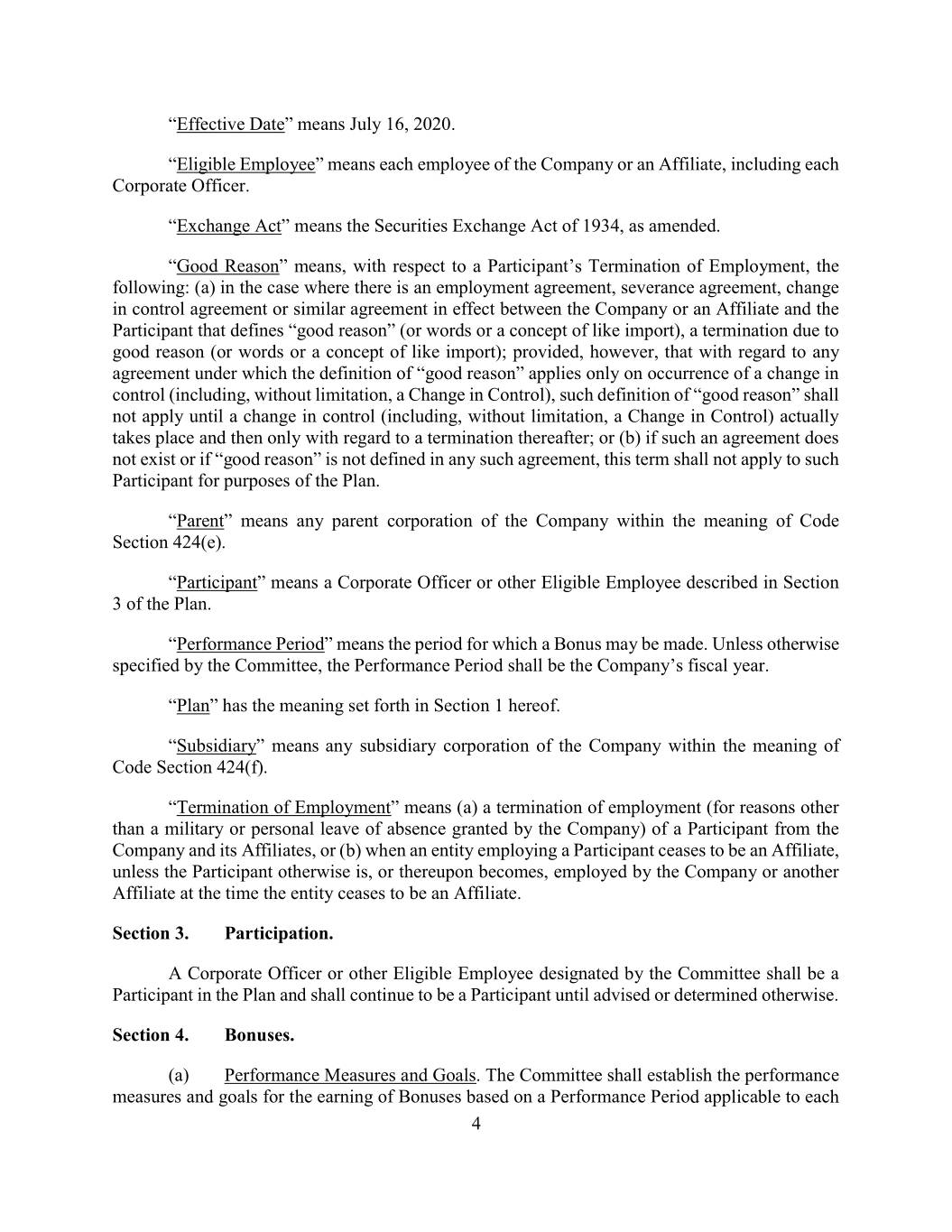 “Effective Date” means July 16, 2020. “Eligible Employee” means each employee of the Company or an Affiliate, including each Corporate Officer. “Exchange Act” means the Securities Exchange Act of 1934, as amended. “Good Reason” means, with respect to a Participant’s Termination of Employment, the following: (a) in the case where there is an employment agreement, severance agreement, change in control agreement or similar agreement in effect between the Company or an Affiliate and the Participant that defines “good reason” (or words or a concept of like import), a termination due to good reason (or words or a concept of like import); provided, however, that with regard to any agreement under which the definition of “good reason” applies only on occurrence of a change in control (including, without limitation, a Change in Control), such definition of “good reason” shall not apply until a change in control (including, without limitation, a Change in Control) actually takes place and then only with regard to a termination thereafter; or (b) if such an agreement does not exist or if “good reason” is not defined in any such agreement, this term shall not apply to such Participant for purposes of the Plan. “Parent” means any parent corporation of the Company within the meaning of Code Section 424(e). “Participant” means a Corporate Officer or other Eligible Employee described in Section 3 of the Plan. “Performance Period” means the period for which a Bonus may be made. Unless otherwise specified by the Committee, the Performance Period shall be the Company’s fiscal year. “Plan” has the meaning set forth in Section 1 hereof. “Subsidiary” means any subsidiary corporation of the Company within the meaning of Code Section 424(f). “Termination of Employment” means (a) a termination of employment (for reasons other than a military or personal leave of absence granted by the Company) of a Participant from the Company and its Affiliates, or (b) when an entity employing a Participant ceases to be an Affiliate, unless the Participant otherwise is, or thereupon becomes, employed by the Company or another Affiliate at the time the entity ceases to be an Affiliate. Section 3. Participation. A Corporate Officer or other Eligible Employee designated by the Committee shall be a Participant in the Plan and shall continue to be a Participant until advised or determined otherwise. Section 4. Bonuses. (a) Performance Measures and Goals. The Committee shall establish the performance measures and goals for the earning of Bonuses based on a Performance Period applicable to each 4