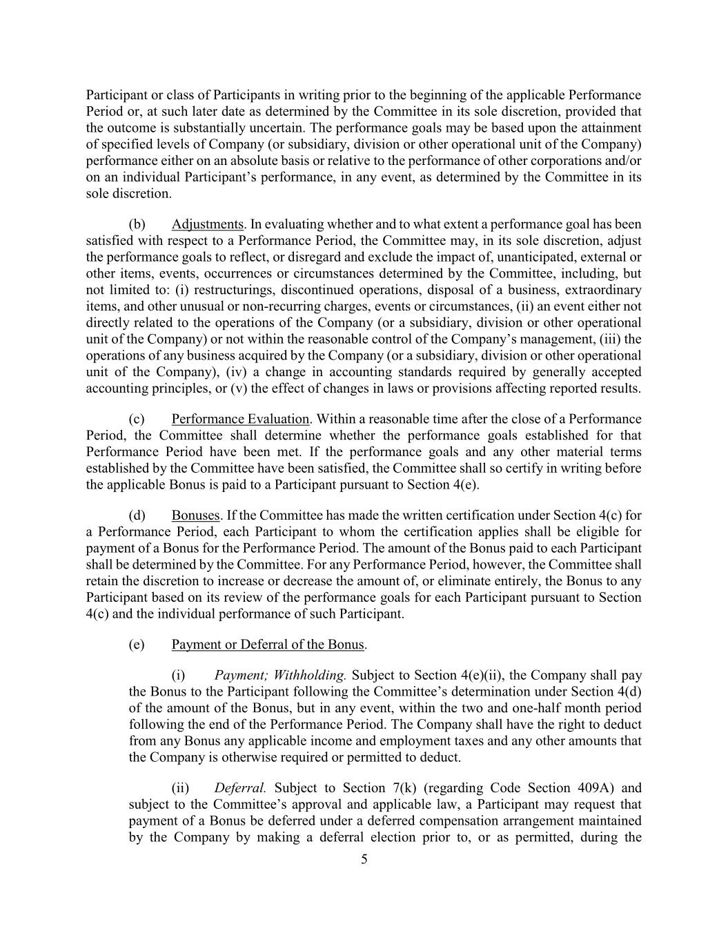 Participant or class of Participants in writing prior to the beginning of the applicable Performance Period or, at such later date as determined by the Committee in its sole discretion, provided that the outcome is substantially uncertain. The performance goals may be based upon the attainment of specified levels of Company (or subsidiary, division or other operational unit of the Company) performance either on an absolute basis or relative to the performance of other corporations and/or on an individual Participant’s performance, in any event, as determined by the Committee in its sole discretion. (b) Adjustments. In evaluating whether and to what extent a performance goal has been satisfied with respect to a Performance Period, the Committee may, in its sole discretion, adjust the performance goals to reflect, or disregard and exclude the impact of, unanticipated, external or other items, events, occurrences or circumstances determined by the Committee, including, but not limited to: (i) restructurings, discontinued operations, disposal of a business, extraordinary items, and other unusual or non-recurring charges, events or circumstances, (ii) an event either not directly related to the operations of the Company (or a subsidiary, division or other operational unit of the Company) or not within the reasonable control of the Company’s management, (iii) the operations of any business acquired by the Company (or a subsidiary, division or other operational unit of the Company), (iv) a change in accounting standards required by generally accepted accounting principles, or (v) the effect of changes in laws or provisions affecting reported results. (c) Performance Evaluation. Within a reasonable time after the close of a Performance Period, the Committee shall determine whether the performance goals established for that Performance Period have been met. If the performance goals and any other material terms established by the Committee have been satisfied, the Committee shall so certify in writing before the applicable Bonus is paid to a Participant pursuant to Section 4(e). (d) Bonuses. If the Committee has made the written certification under Section 4(c) for a Performance Period, each Participant to whom the certification applies shall be eligible for payment of a Bonus for the Performance Period. The amount of the Bonus paid to each Participant shall be determined by the Committee. For any Performance Period, however, the Committee shall retain the discretion to increase or decrease the amount of, or eliminate entirely, the Bonus to any Participant based on its review of the performance goals for each Participant pursuant to Section 4(c) and the individual performance of such Participant. (e) Payment or Deferral of the Bonus. (i) Payment; Withholding. Subject to Section 4(e)(ii), the Company shall pay the Bonus to the Participant following the Committee’s determination under Section 4(d) of the amount of the Bonus, but in any event, within the two and one-half month period following the end of the Performance Period. The Company shall have the right to deduct from any Bonus any applicable income and employment taxes and any other amounts that the Company is otherwise required or permitted to deduct. (ii) Deferral. Subject to Section 7(k) (regarding Code Section 409A) and subject to the Committee’s approval and applicable law, a Participant may request that payment of a Bonus be deferred under a deferred compensation arrangement maintained by the Company by making a deferral election prior to, or as permitted, during the 5