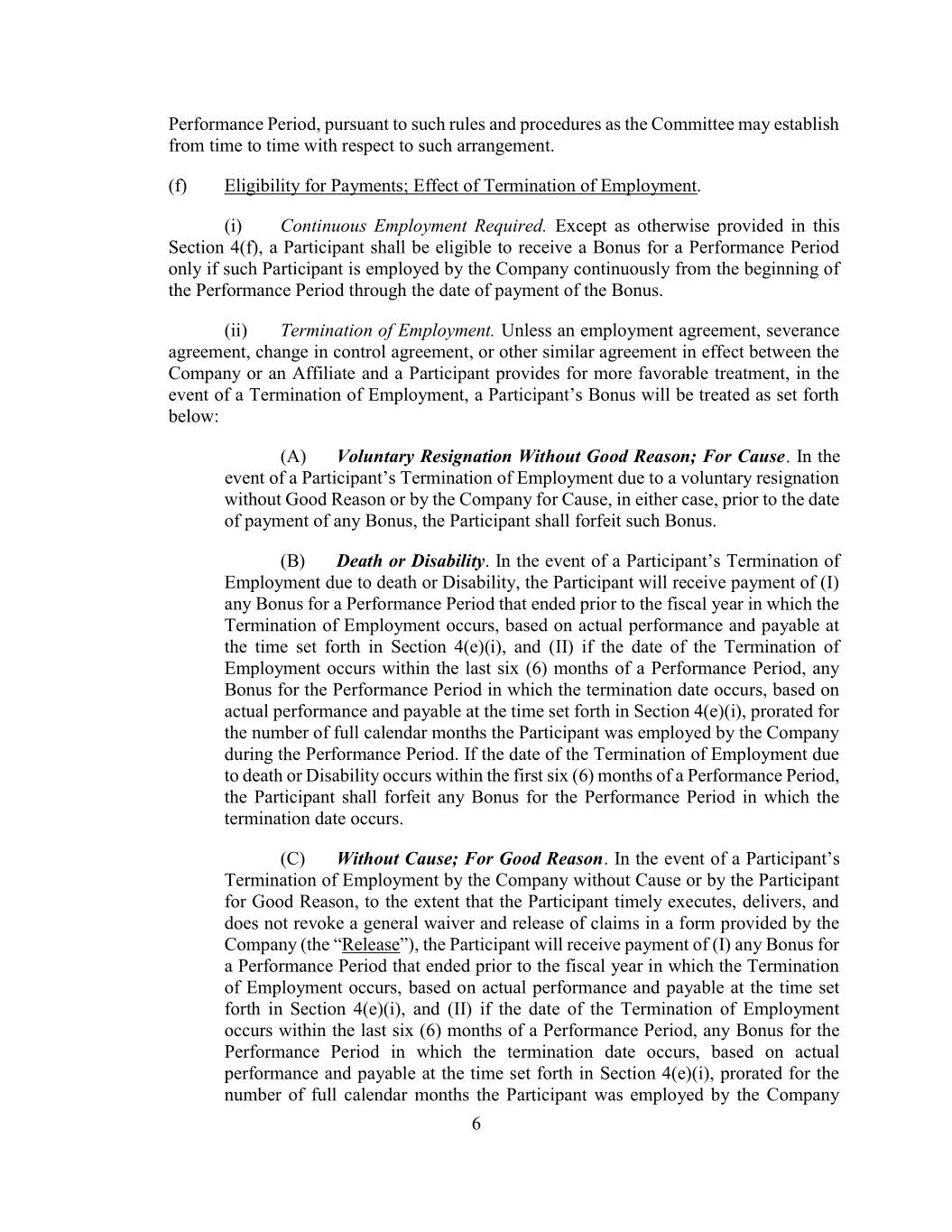 Performance Period, pursuant to such rules and procedures as the Committee may establish from time to time with respect to such arrangement. (f) Eligibility for Payments; Effect of Termination of Employment. (i) Continuous Employment Required. Except as otherwise provided in this Section 4(f), a Participant shall be eligible to receive a Bonus for a Performance Period only if such Participant is employed by the Company continuously from the beginning of the Performance Period through the date of payment of the Bonus. (ii) Termination of Employment. Unless an employment agreement, severance agreement, change in control agreement, or other similar agreement in effect between the Company or an Affiliate and a Participant provides for more favorable treatment, in the event of a Termination of Employment, a Participant’s Bonus will be treated as set forth below: (A) Voluntary Resignation Without Good Reason; For Cause. In the event of a Participant’s Termination of Employment due to a voluntary resignation without Good Reason or by the Company for Cause, in either case, prior to the date of payment of any Bonus, the Participant shall forfeit such Bonus. (B) Death or Disability. In the event of a Participant’s Termination of Employment due to death or Disability, the Participant will receive payment of (I) any Bonus for a Performance Period that ended prior to the fiscal year in which the Termination of Employment occurs, based on actual performance and payable at the time set forth in Section 4(e)(i), and (II) if the date of the Termination of Employment occurs within the last six (6) months of a Performance Period, any Bonus for the Performance Period in which the termination date occurs, based on actual performance and payable at the time set forth in Section 4(e)(i), prorated for the number of full calendar months the Participant was employed by the Company during the Performance Period. If the date of the Termination of Employment due to death or Disability occurs within the first six (6) months of a Performance Period, the Participant shall forfeit any Bonus for the Performance Period in which the termination date occurs. (C) Without Cause; For Good Reason. In the event of a Participant’s Termination of Employment by the Company without Cause or by the Participant for Good Reason, to the extent that the Participant timely executes, delivers, and does not revoke a general waiver and release of claims in a form provided by the Company (the “Release”), the Participant will receive payment of (I) any Bonus for a Performance Period that ended prior to the fiscal year in which the Termination of Employment occurs, based on actual performance and payable at the time set forth in Section 4(e)(i), and (II) if the date of the Termination of Employment occurs within the last six (6) months of a Performance Period, any Bonus for the Performance Period in which the termination date occurs, based on actual performance and payable at the time set forth in Section 4(e)(i), prorated for the number of full calendar months the Participant was employed by the Company 6