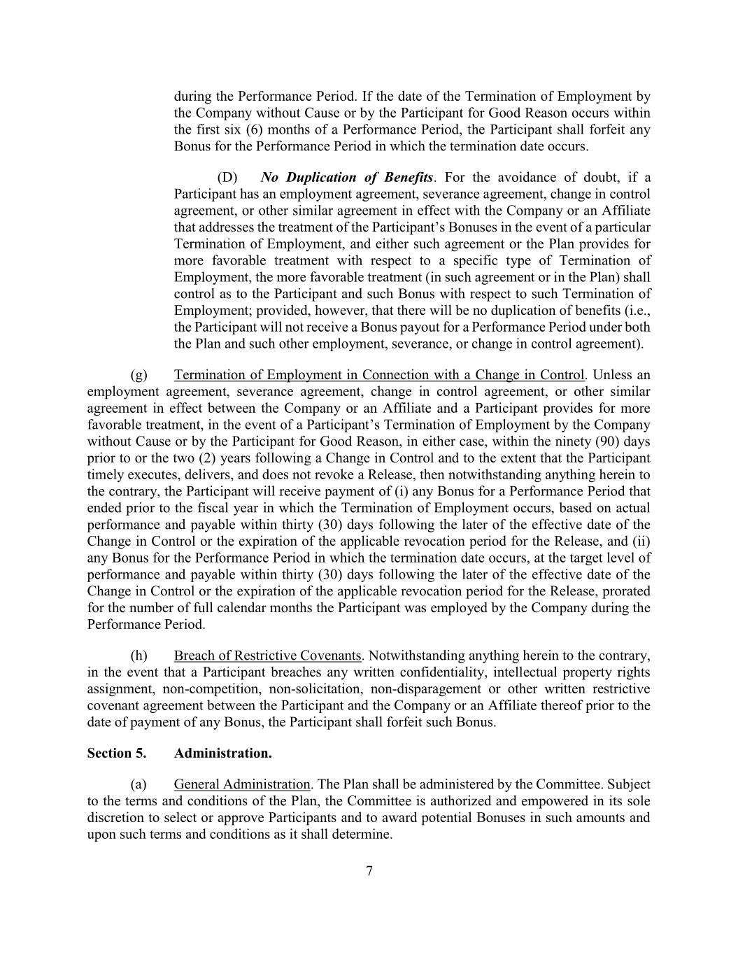 during the Performance Period. If the date of the Termination of Employment by the Company without Cause or by the Participant for Good Reason occurs within the first six (6) months of a Performance Period, the Participant shall forfeit any Bonus for the Performance Period in which the termination date occurs. (D) No Duplication of Benefits. For the avoidance of doubt, if a Participant has an employment agreement, severance agreement, change in control agreement, or other similar agreement in effect with the Company or an Affiliate that addresses the treatment of the Participant’s Bonuses in the event of a particular Termination of Employment, and either such agreement or the Plan provides for more favorable treatment with respect to a specific type of Termination of Employment, the more favorable treatment (in such agreement or in the Plan) shall control as to the Participant and such Bonus with respect to such Termination of Employment; provided, however, that there will be no duplication of benefits (i.e., the Participant will not receive a Bonus payout for a Performance Period under both the Plan and such other employment, severance, or change in control agreement). (g) Termination of Employment in Connection with a Change in Control. Unless an employment agreement, severance agreement, change in control agreement, or other similar agreement in effect between the Company or an Affiliate and a Participant provides for more favorable treatment, in the event of a Participant’s Termination of Employment by the Company without Cause or by the Participant for Good Reason, in either case, within the ninety (90) days prior to or the two (2) years following a Change in Control and to the extent that the Participant timely executes, delivers, and does not revoke a Release, then notwithstanding anything herein to the contrary, the Participant will receive payment of (i) any Bonus for a Performance Period that ended prior to the fiscal year in which the Termination of Employment occurs, based on actual performance and payable within thirty (30) days following the later of the effective date of the Change in Control or the expiration of the applicable revocation period for the Release, and (ii) any Bonus for the Performance Period in which the termination date occurs, at the target level of performance and payable within thirty (30) days following the later of the effective date of the Change in Control or the expiration of the applicable revocation period for the Release, prorated for the number of full calendar months the Participant was employed by the Company during the Performance Period. (h) Breach of Restrictive Covenants. Notwithstanding anything herein to the contrary, in the event that a Participant breaches any written confidentiality, intellectual property rights assignment, non-competition, non-solicitation, non-disparagement or other written restrictive covenant agreement between the Participant and the Company or an Affiliate thereof prior to the date of payment of any Bonus, the Participant shall forfeit such Bonus. Section 5. Administration. (a) General Administration. The Plan shall be administered by the Committee. Subject to the terms and conditions of the Plan, the Committee is authorized and empowered in its sole discretion to select or approve Participants and to award potential Bonuses in such amounts and upon such terms and conditions as it shall determine. 7