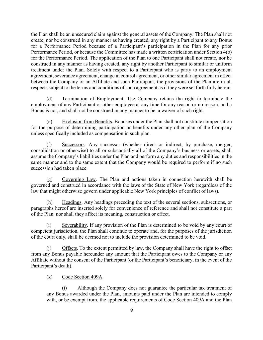 the Plan shall be an unsecured claim against the general assets of the Company. The Plan shall not create, nor be construed in any manner as having created, any right by a Participant to any Bonus for a Performance Period because of a Participant’s participation in the Plan for any prior Performance Period, or because the Committee has made a written certification under Section 4(b) for the Performance Period. The application of the Plan to one Participant shall not create, nor be construed in any manner as having created, any right by another Participant to similar or uniform treatment under the Plan. Solely with respect to a Participant who is party to an employment agreement, severance agreement, change in control agreement, or other similar agreement in effect between the Company or an Affiliate and such Participant, the provisions of the Plan are in all respects subject to the terms and conditions of such agreement as if they were set forth fully herein. (d) Termination of Employment. The Company retains the right to terminate the employment of any Participant or other employee at any time for any reason or no reason, and a Bonus is not, and shall not be construed in any manner to be, a waiver of such right. (e) Exclusion from Benefits. Bonuses under the Plan shall not constitute compensation for the purpose of determining participation or benefits under any other plan of the Company unless specifically included as compensation in such plan. (f) Successors. Any successor (whether direct or indirect, by purchase, merger, consolidation or otherwise) to all or substantially all of the Company’s business or assets, shall assume the Company’s liabilities under the Plan and perform any duties and responsibilities in the same manner and to the same extent that the Company would be required to perform if no such succession had taken place. (g) Governing Law. The Plan and actions taken in connection herewith shall be governed and construed in accordance with the laws of the State of New York (regardless of the law that might otherwise govern under applicable New York principles of conflict of laws). (h) Headings. Any headings preceding the text of the several sections, subsections, or paragraphs hereof are inserted solely for convenience of reference and shall not constitute a part of the Plan, nor shall they affect its meaning, construction or effect. (i) Severability. If any provision of the Plan is determined to be void by any court of competent jurisdiction, the Plan shall continue to operate and, for the purposes of the jurisdiction of the court only, shall be deemed not to include the provision determined to be void. (j) Offsets. To the extent permitted by law, the Company shall have the right to offset from any Bonus payable hereunder any amount that the Participant owes to the Company or any Affiliate without the consent of the Participant (or the Participant’s beneficiary, in the event of the Participant’s death). (k) Code Section 409A. (i) Although the Company does not guarantee the particular tax treatment of any Bonus awarded under the Plan, amounts paid under the Plan are intended to comply with, or be exempt from, the applicable requirements of Code Section 409A and the Plan 9