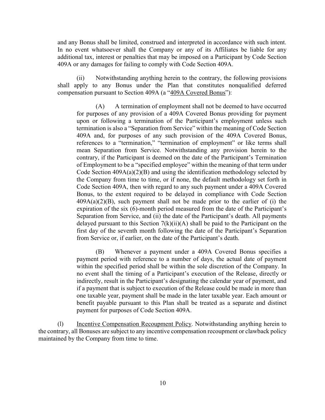 and any Bonus shall be limited, construed and interpreted in accordance with such intent. In no event whatsoever shall the Company or any of its Affiliates be liable for any additional tax, interest or penalties that may be imposed on a Participant by Code Section 409A or any damages for failing to comply with Code Section 409A. (ii) Notwithstanding anything herein to the contrary, the following provisions shall apply to any Bonus under the Plan that constitutes nonqualified deferred compensation pursuant to Section 409A (a “409A Covered Bonus”): (A) A termination of employment shall not be deemed to have occurred for purposes of any provision of a 409A Covered Bonus providing for payment upon or following a termination of the Participant’s employment unless such termination is also a “Separation from Service” within the meaning of Code Section 409A and, for purposes of any such provision of the 409A Covered Bonus, references to a “termination,” “termination of employment” or like terms shall mean Separation from Service. Notwithstanding any provision herein to the contrary, if the Participant is deemed on the date of the Participant’s Termination of Employment to be a “specified employee” within the meaning of that term under Code Section 409A(a)(2)(B) and using the identification methodology selected by the Company from time to time, or if none, the default methodology set forth in Code Section 409A, then with regard to any such payment under a 409A Covered Bonus, to the extent required to be delayed in compliance with Code Section 409A(a)(2)(B), such payment shall not be made prior to the earlier of (i) the expiration of the six (6)-month period measured from the date of the Participant’s Separation from Service, and (ii) the date of the Participant’s death. All payments delayed pursuant to this Section 7(k)(ii)(A) shall be paid to the Participant on the first day of the seventh month following the date of the Participant’s Separation from Service or, if earlier, on the date of the Participant’s death. (B) Whenever a payment under a 409A Covered Bonus specifies a payment period with reference to a number of days, the actual date of payment within the specified period shall be within the sole discretion of the Company. In no event shall the timing of a Participant’s execution of the Release, directly or indirectly, result in the Participant’s designating the calendar year of payment, and if a payment that is subject to execution of the Release could be made in more than one taxable year, payment shall be made in the later taxable year. Each amount or benefit payable pursuant to this Plan shall be treated as a separate and distinct payment for purposes of Code Section 409A. (l) Incentive Compensation Recoupment Policy. Notwithstanding anything herein to the contrary, all Bonuses are subject to any incentive compensation recoupment or clawback policy maintained by the Company from time to time. 10